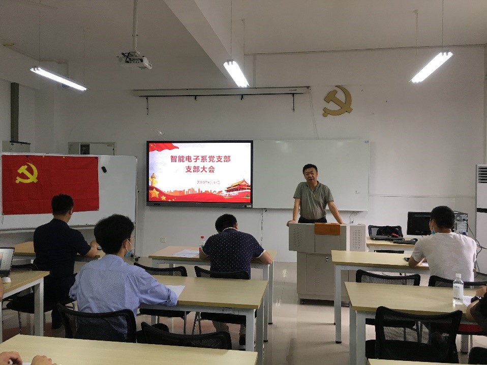 6月15日智能电子系党支部在12504召开党员大会,就党员发展及预备党员转正事宜进行讨论,支部书记王用鑫主持会议。