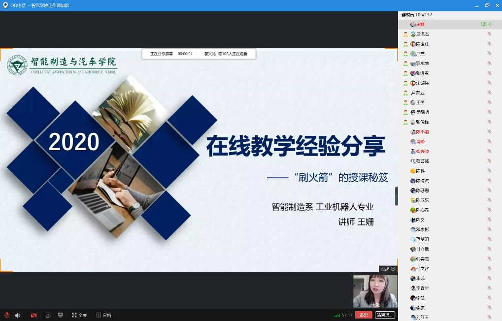 为落实学校疫情防控期间线上教学工作相关要求,进一步提升学院的线上教学质量,适应新的教学模式和观念的转变。智能制造与汽车学院于2020年4月30日下午2点通过QQ视频会议的方式开展了线上教学经验交流与分享会,全院教职工参加了此次分享会。