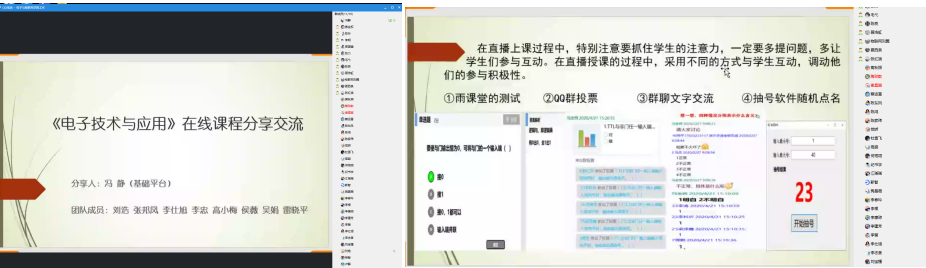 基础平台以《电子技术与应用》课程为例,由冯静老师代表课程团队分享,从教学平台选择、教学实施过程、思考总结三个方面进行线上教学经验分享,教学过程中通过多种教学方式和教学资源相结合,尽可能以形象直观的教学化难为易、化抽象为具体。冯老师的课程团队充分利用导学单,让学生清楚每周学习内容,知道每次课课前、课中及课后具体任务,更利于学生安排好自己的学习计划,学生的疑难问题也能得到及时反馈。在加强学生学习注意力方面,采用4种不同的方式与学生互动,调动他们的参与积极性。
