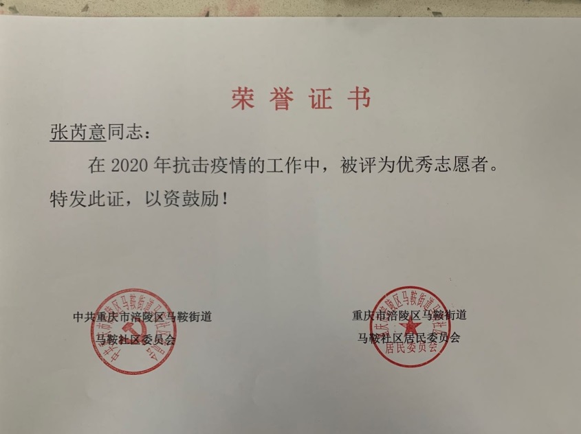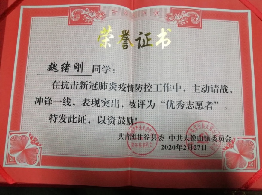 疫情防控是一场保卫人民群众生命安全和身体健康的严峻斗争。作为新时代青年大学生,魏绪刚、张芮意、周彦昊等同学主动到社区报到,助力身边的疫情防控工作。他们在参与志愿工作中,听从指挥,服从所分派的工作任务,挺身而出,用自己的实际行动展现出青年一代的责任与担当,汇聚起战胜疫情的强大青春力量。 魏绪刚、张芮意等同学还因表现突出,被相关部门评为 “优秀志愿者”。