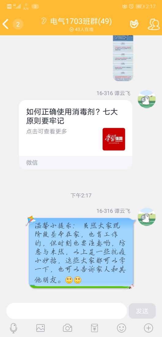 科学是战胜疫情的良方,自获知疫情信息以来,电气1703班团支部通过视频会议、分享防疫小知识等方式,带动支部成员学习疫情防控有关的政策和科学知识,关注最新疫情动态,让每个成员在疫情防控工作中做个“明白人”。同时,学习委员谭云飞和寝室长易鑫积极当起了科普员,通过QQ群消息转发防疫知识,告诉同学们如何阻断病毒传播,如何避免交叉感染,要相信科学,遵从政府的决定,从自身做起,讲究卫生,学好病毒预防知识。同时也让同学们明白,国家兴亡,匹夫有责,世间若有岁月静好,那一定是有人在替我们负重前行。