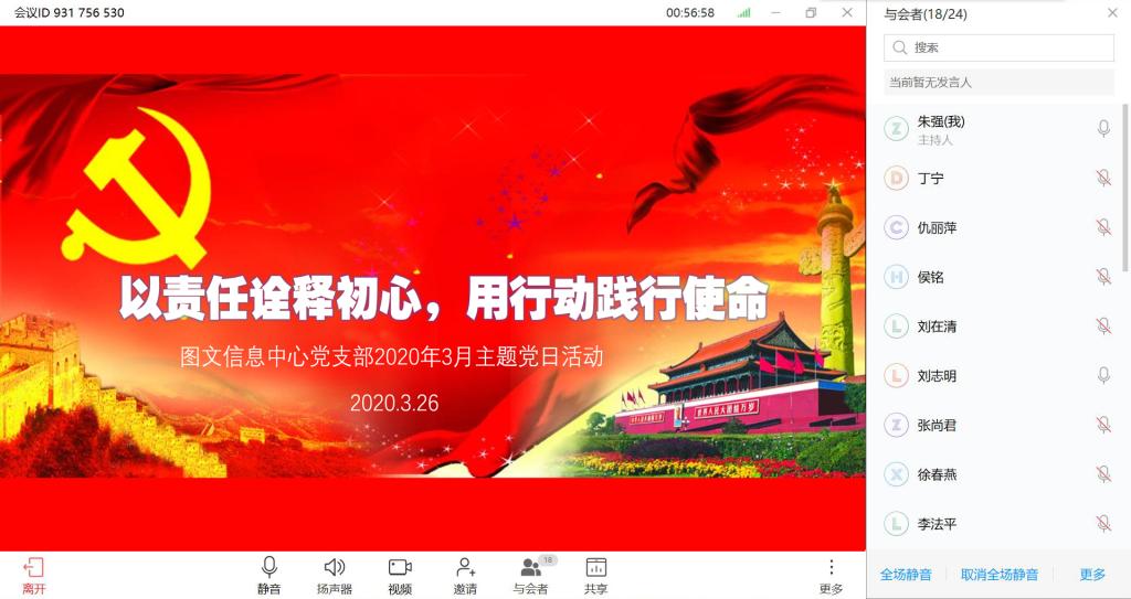 根据学校推进“两学一做”学习教育常态化制度工作需求,按照学校党委组织部通知安排。图文信息中心党支部于2020年3月26日下午14时至16时视频在线举行“以责任诠释初心,用行动践行使命”为主题的特殊主题党日活动。该支部18名党员同志通过视频连线方式参加研讨学习《习近平在统筹推进新冠肺炎疫情防控和经济社会发展工作部署会议上的讲话》《中共教育部党组关于统筹做好教育系统新冠肺炎疫情防控和教育改革发展工作的通知》《陈敏尔在进一步统筹推进新冠肺炎疫情防控和经济社会发展工作视频会议上的讲话精神》《中国共产党重庆市第五届纪律检查委员会第四次全体会议精神》。在对规定内容学习完毕后,向全体与会党员通报了学校和本支部党员自愿捐款情况。