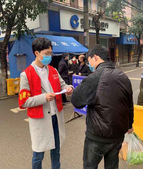 电子与物联网学院智能电子系2017级同学刘康,原本在家等待疫情好转回企业复工。一个偶然的机会他在开州日报上看到了镇政府召集自愿者的信息。刘康同学是一名入党积极分子,这时他想到的是要同成千上万的党员一样,在疫情发生时挺身而出站在防疫第一线!作为志愿者他自感光荣,仅参加了一天的岗前培训就开始了工作。工作地点在开州区长沙镇锦橙社区内轮岗,有时需要走半个小时以上的路程,每天从早上8:30一直工作到下午5:30。他的工作是主要负责维持本镇人流量最大的该卡点路口的秩序,严格落实镇党委政府要求,认真检查通行证,一律不允许无通行证的车辆及行人通过。在这种人员密度大,工作时间长的条件下工作,感染病毒的几率高,我们都为刘康同学捏一把汗。而不顾个人安危的刘康同学心想的是切实堵断疫情传播及扩散,联防联控,打赢这场“战疫”。刘康的无私奉献是我们系的骄傲,值得广大同学学习的榜样。这里还要给刘康同学说一声多保重。