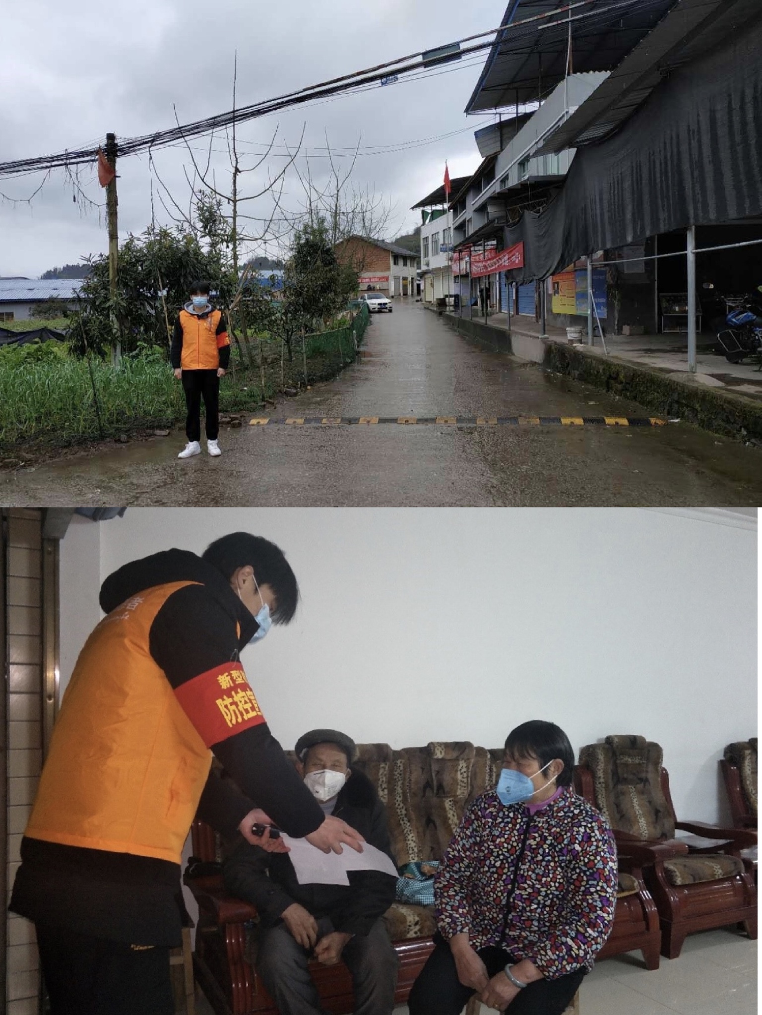 图为周东同学参加防疫志愿工作场景