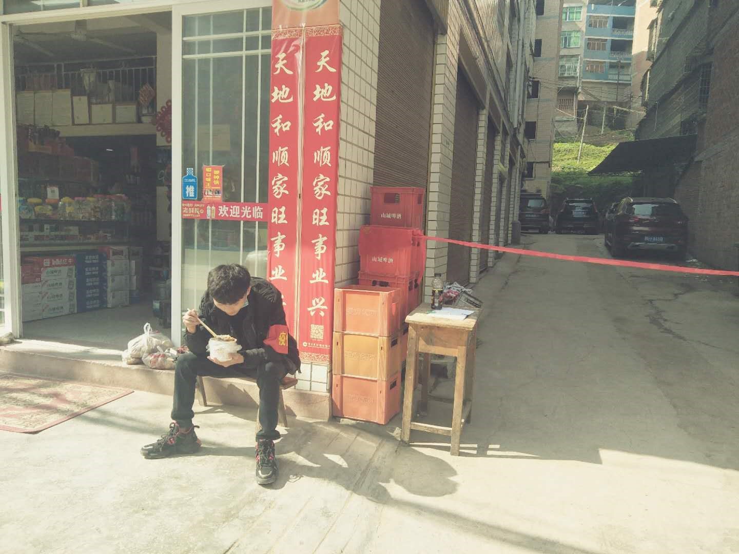 袁松同学因防疫值班需要在坚守的工作岗位上吃饭