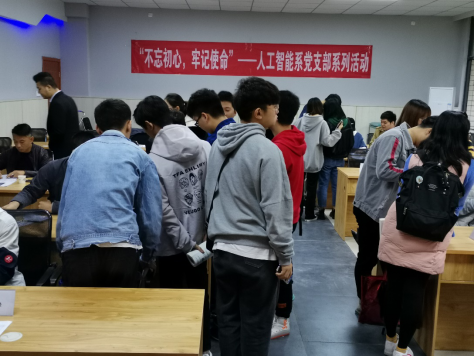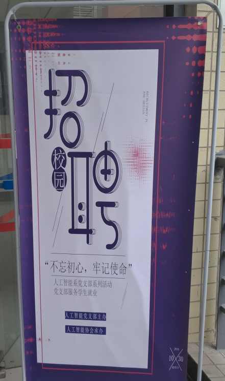 为了进一步响应学校党委和学院党总支关于“支部建设在专业上”、“发挥党支部战斗堡垒作用”的号召,践行“不忘初心、牢记使命”主题教育的宗旨,2019年10月25日上午,人工智能与大数据学院人工智能系党支部在四教学楼一楼举办了服务学生就业专场招聘活动,为毕业生做好事,服好务。
