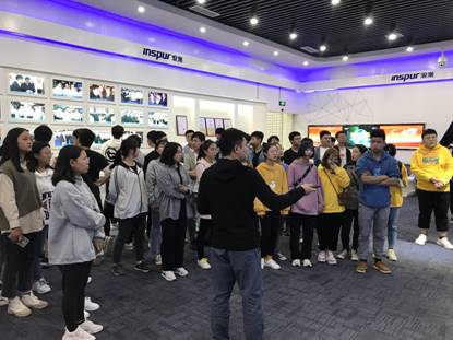 最后,同学们来到了浪潮(重庆)云计算中心的主展厅,袁一群工程师为同学们讲解了浪潮集团的发展历史、主营业务以及获得的荣誉等,同学们饶有兴趣地听取讲解,并结合各自实际情况与工程师进行互动交流。