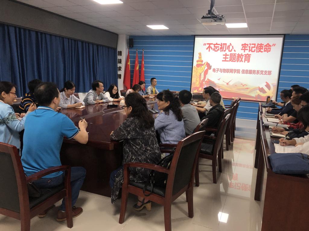 2019年9月19日下午,电子与物联网学院信息服务系党支部在12-507A会议室开展了“不忘初心、牢记使命”主题教育工作会议。系部党员、教师及学生党员共20余人参加了会议。