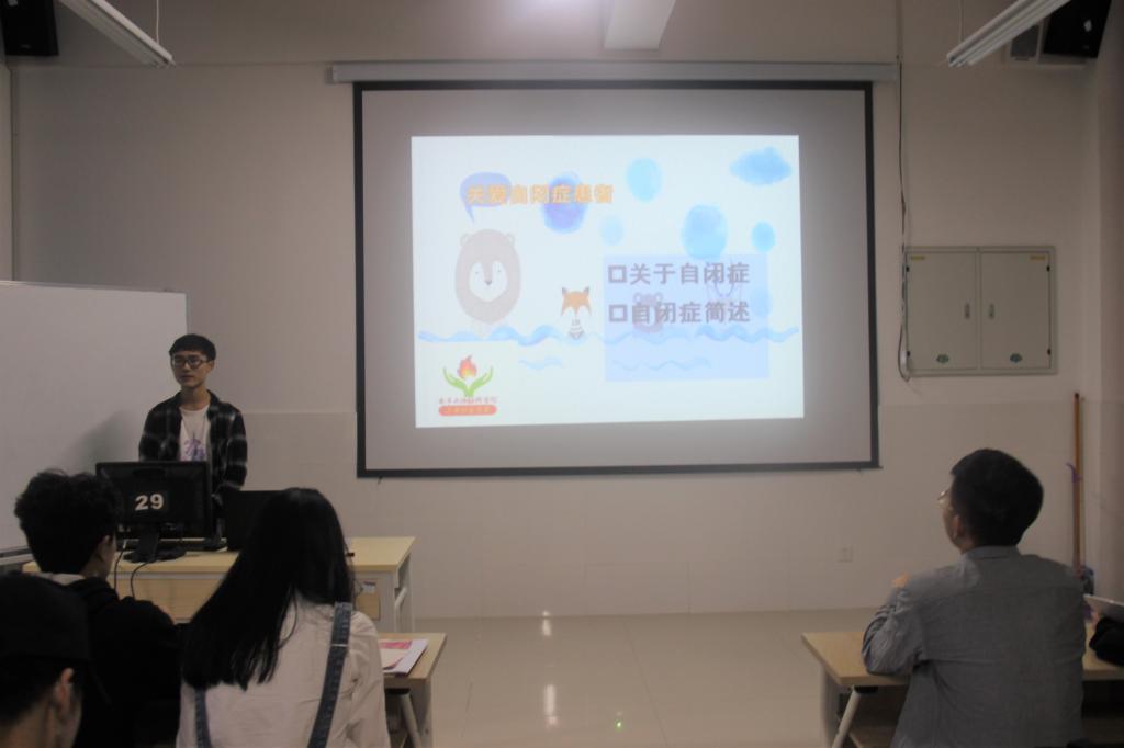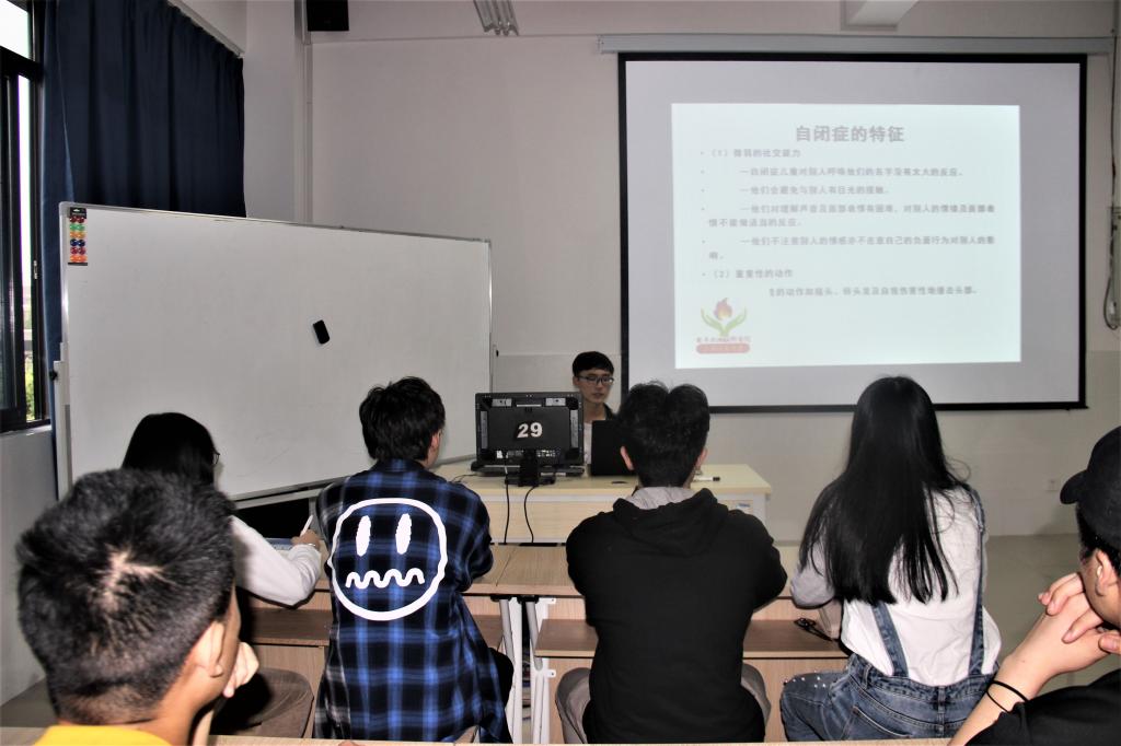 本次主题团生活由电子与物联网学院小手炉服务支队队长梁福强学长为我们介绍了有关自闭儿童的一些情况和我们如何去关爱自闭儿童。首先梁福强学长简单的告诉了我们什么是自闭症?典型的特征是什么?自闭症不是一种疾病,而是一种因官能失调所引起的脑部功能失调的其中一种现象。典型的自闭症呈现三种病症:微弱的社交能力;不容易用口语或非口语来进行沟通;不正常或严重缺乏社会活动。我们“小手炉”主要的帮扶基地有两个:一个是石井坡基地,另外一个是南坪基地。 然后梁福强学长重点告诉我们怎么去照顾患有自闭症的孩子,我们应该主动去和自闭儿童进行交流,多用眼神去鼓励他们。有些孩子会有一些依恋的物件,我们可以利用这些东西去吸引这些孩子,从而引导他们和我们志愿者多交流,减轻患病程度。最后我们通过视频了解到国外专家对自闭症患者的阐述。