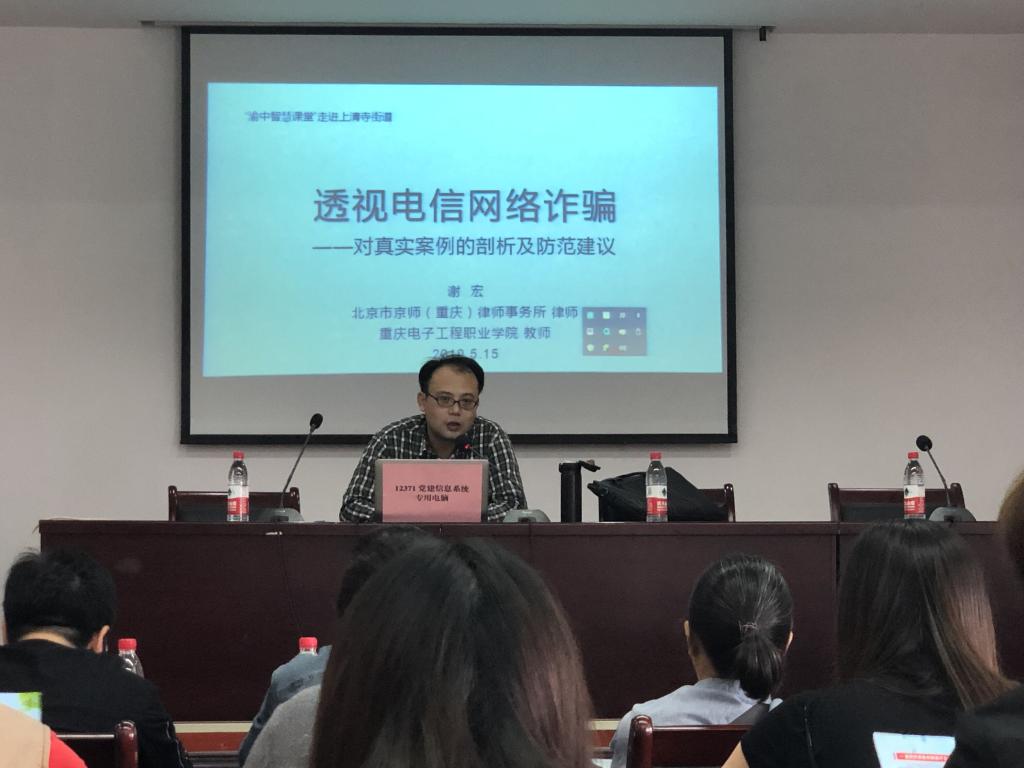 谢宏老师以“透视电信网络诈骗——对真实案例的剖析及防范建议”为题,为社区居民举办了一场生动、贴近生活的普法讲座。持续1个半小时的讲座中,谢宏老师首先对“什么是电信网络诈骗”进行讲解,接着通过其经手的网络诈骗实例做深入分析,最后引导听众进行反思与防范,并通过问答方式与社区居民进行互动交流。