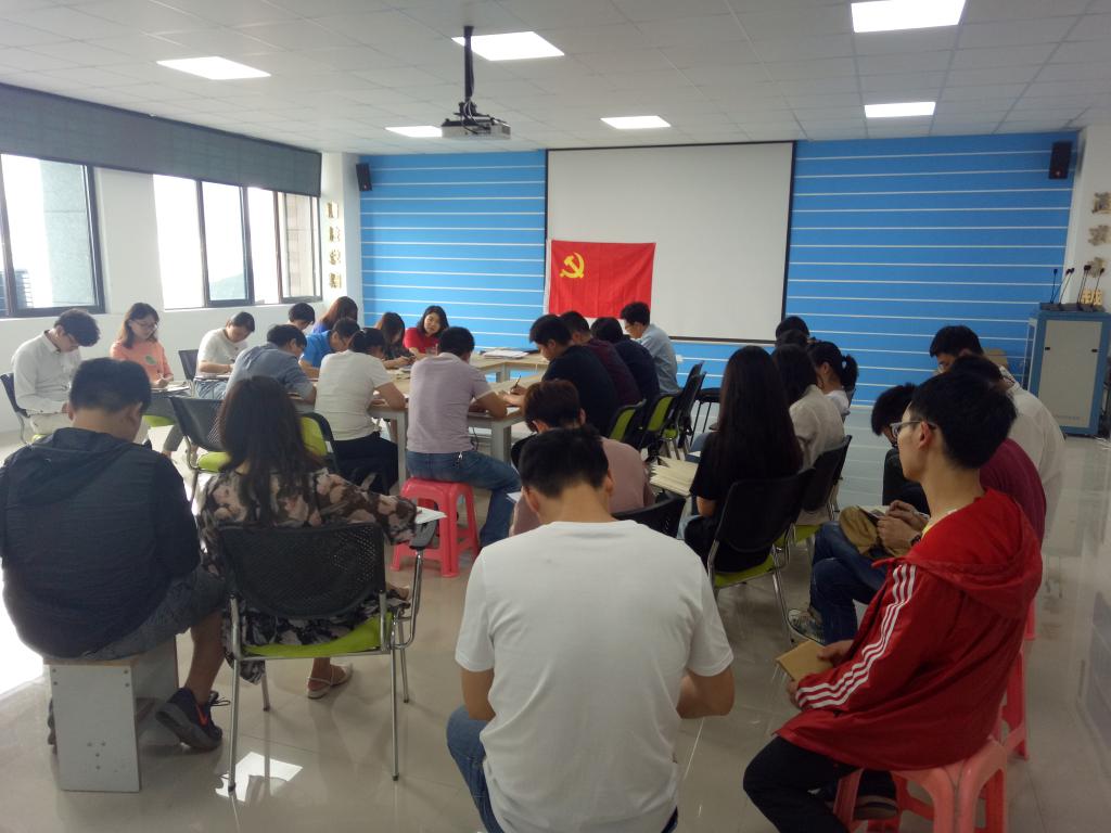 会议室高挂党旗,全体支部党员佩戴党员徽章,参加此次主题党日活动,活动由支部书记徐欣同志主持。会议第一项由徐欣同志领学《习近平新时代中国特色社会主义思想三十讲》第二十九讲;靳智同志领学干部人事档案工作条例和中国共产党重大事项请示报告条例。全体同志学习习近平总书记在学校思政理论课教师座谈会上的重要讲话精神和在中央党校省部级主要领导干部坚持底线思维着力防范化解重大风险专题研讨班开班仪式上的重要讲话精神。张二元同志领学十九届中央纪委三次全会精神、重庆市纪委五届三次全会精神,结合纪念五四运动100周年,选学《马克思主义经典著作宣读》部分章节。徐欣同志结合“对标争先”建设计划,引导党员学习邹碧华、谢晋、钟扬、牛犇等先进典型。会议第二项,全体师生党员依据学习内容,展开交流讨论。刘跃同志表示:深刻领会五四运动精神,践行马克思主义;邱雷同志表示:全面从严治党取得战略性成功,要巩固反腐败斗争压倒性胜利。张鑫同志表示:要努力掌握马克思主义思想方法和工作方法,既要政治过硬,也要本领高强。会议第三项,积极分子代表自我介绍并交流学习心得。会议第四项,主题讨论部分,研讨内容如下:如何创新教学形式和内容,将立德树人融入专业人才培养与课程教学。徐欣同志表示:要加强学生和老师的沟通,建立良好的沟通渠道;周攀同志表示:希望课后也有相关思想政治的学习途经;陈家玮同志表示:加强“立德”的引导,可以将辅导员谈心融入思政。