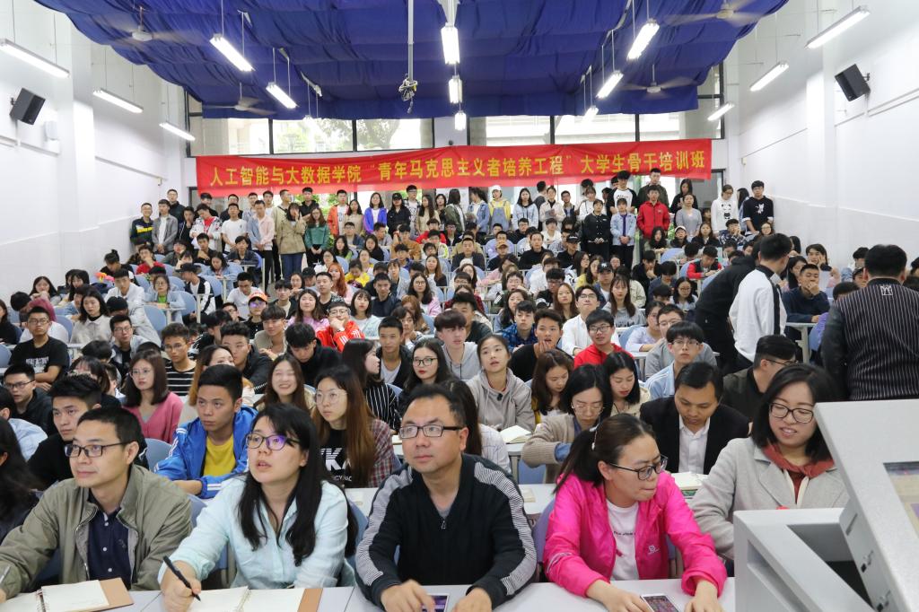 2019年5月7日下午,人工智能与大数据学院党总支吴焱岷书记在南校区7-210教室开展了主题为“牢固树立自信,正确看待中美贸易战,学本领,建功新时代”的主题党课。学院各党支部负责人、预备党员及入党积极分子共180余人参会。