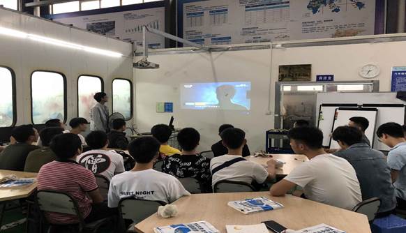图2智汽学院学生在实训车间集体观看反奸防谍宣传片-1