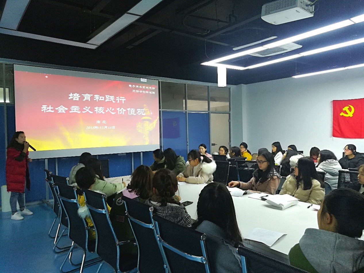 2018年12月18日12:30,财经管理学院电商系党支部康亮书记在北校区10-404教室为电商系23期全体入党积极分子开展党课教育,党课主题为“回顾中国命运改革开放四十年”和“培育和践行社会主义核心价值观”。