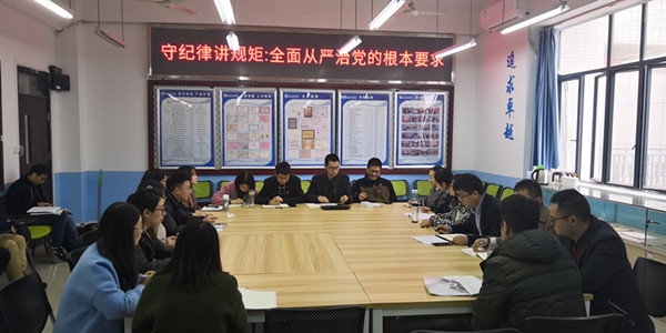 会议室高挂党旗,全体支部党员佩戴党员徽章,参加此次主题党日活动。本次活动由党支部书记徐欣同志主持。会议第一项由张二元同志领学《关于认真学习贯彻〈中国共产党纪律处分条例〉的通知》和《中国共产党纪律处分条例》。会议第二项由徐欣同志领学《中共中央国务院关于全面深化新时代教师队伍建设改革的意见》和《重庆市人民政府关于全面深化新时代教师队伍建设改革的实施意见》。会议第三项由靳智同志领学《毫不动摇把党建设得更加坚强有力》。