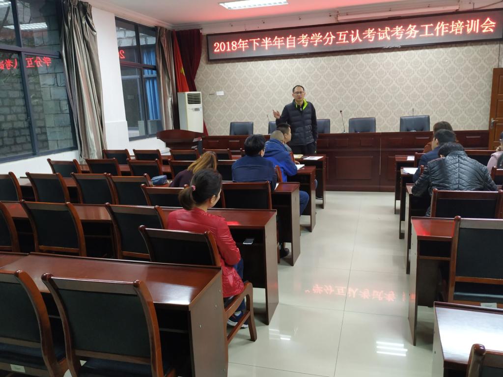 2018年下半年的专科衔接自考本科学分互认考试于11月10-11日在pg国际南校区教学楼2幢4楼顺利进行。为进一步规范考务相关工作,11月10日上午8:00培训与继续教育中心张铁力副主任对参加本次学分互认考试监考教师进行考务工作培训会。