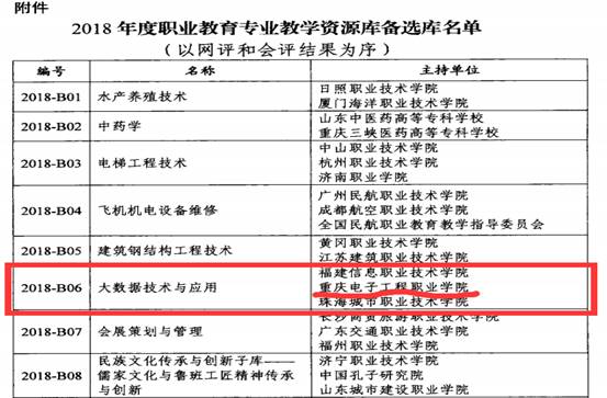 近日,教育部下发《关于公布2018年度职业教育专业教学资源备选库的通知》(教职成司函【2018】121号),pg国际大数据技术与应用专业成功入选国家级职业教育专业教学资源库备选库!