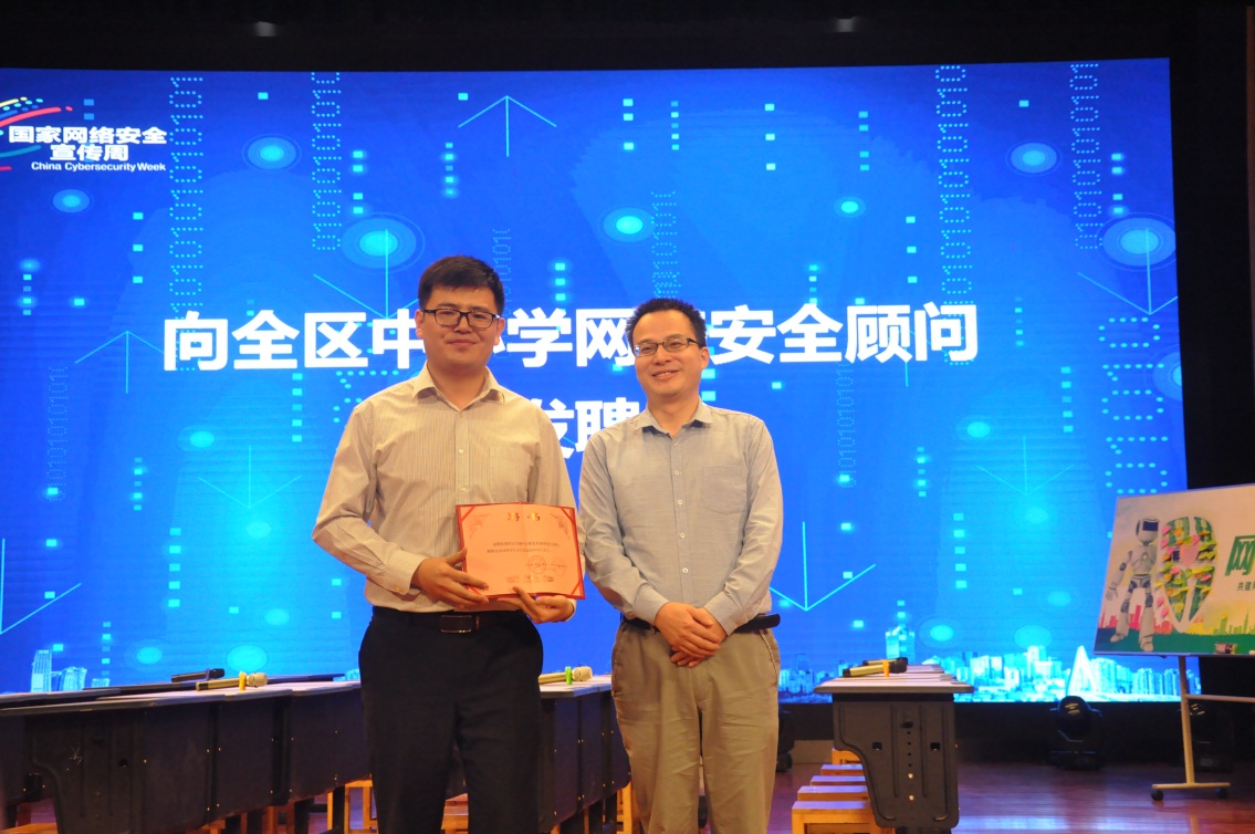 主题班会结束后,渝中区委网信办、区教委联合聘请并由渝中区教委督学龚方德为张靖老师颁发渝中区教育系统网络安全顾问聘书。