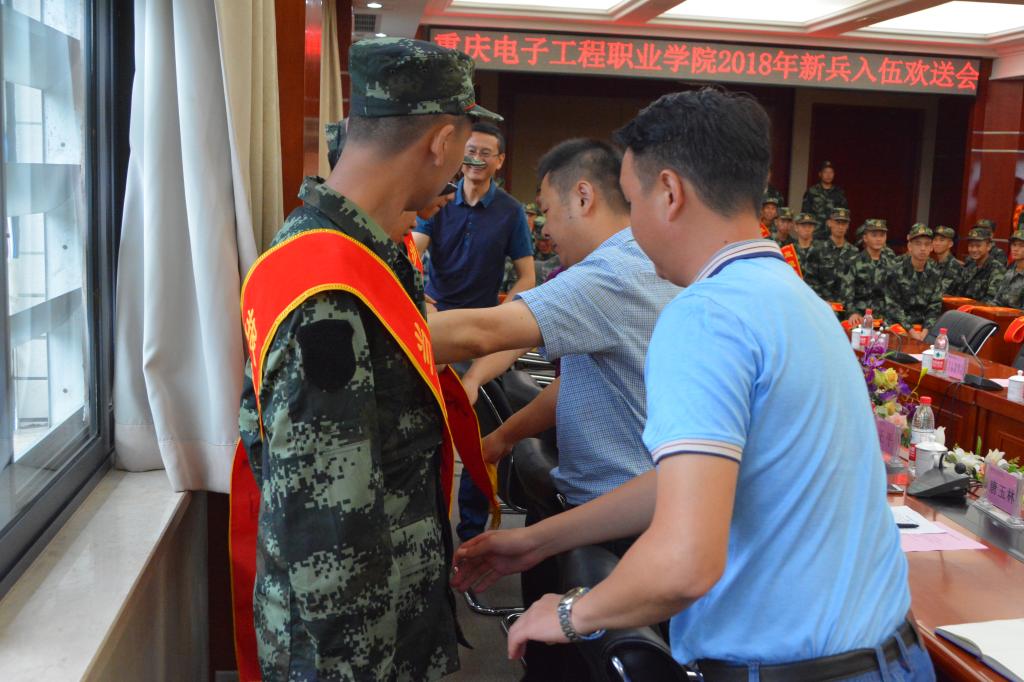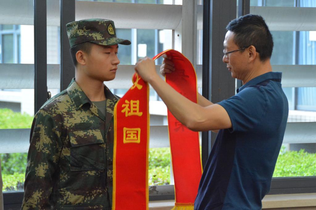 随后,在与会人员热烈的掌声之中,与会领导为入伍学生代表佩戴绶带。