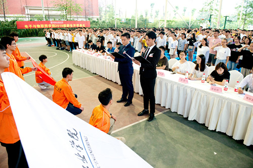 典礼在庄严的国歌声中拉开序幕。面对校旗、院旗,全体新生在学生会主席蒋浩、朱诚的带领下庄严宣誓、佩戴校徽。随后,院长陈良教授致欢迎词,在对2018级新同学的到来表示热烈的欢迎的同时,也对同学们提出了美好的希冀。陈院长从师资力量、专业建设、就业方向、学生活动等几个方面对电子与物联网学校进行介绍,对学院的专业特色、优势项目进行阐述,鼓励同学们以满怀的热情扎实学好专业知识,以坚韧的品行迎接未来的挑战,以饱满的姿态迎接美好的大学生活。