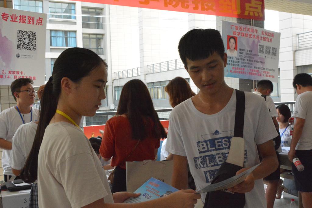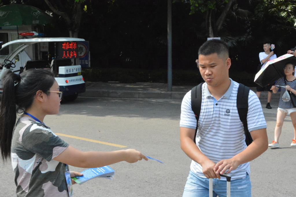 从报到点到宿舍区的路上,我们的志愿者一边指路,一边进行安全宣传,不要去接陌生电话,不要去理上门推销的人。