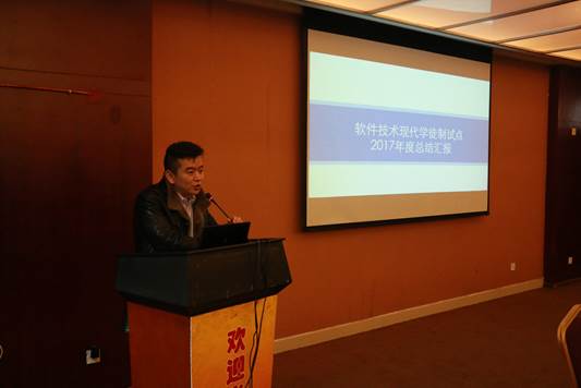 2018年1月12日、13日,软件学院举行了“软件技术(现代学徒制)2018年度工作计划报告与校企课程研讨会”。软件学院领导、教务处领导、11家合作企业代表、“现代学徒制”项目组成员、软件学院工作室负责人及教师代表等共计近40人参加了本次会议。