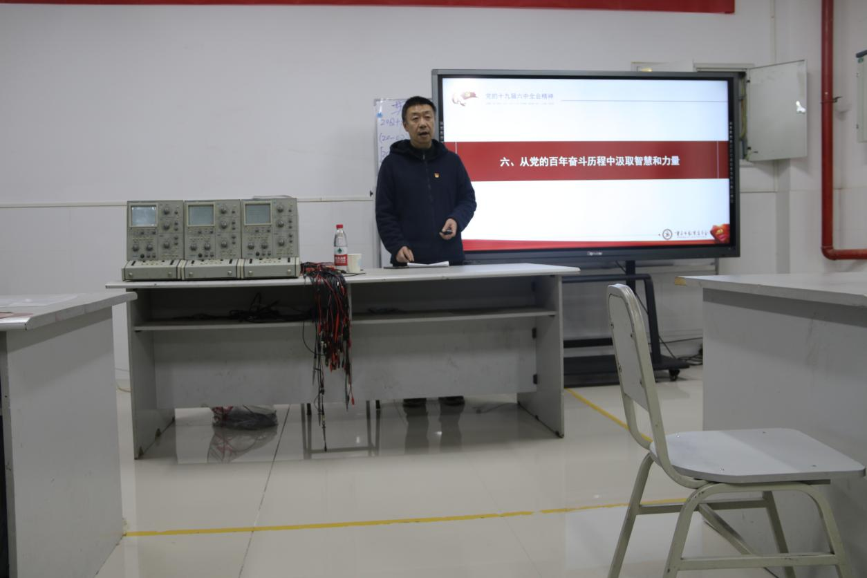图为张书记为同学们宣讲党的十九届六中全会精神