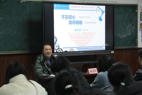 12月20日晚,学院院长谢光辉教授以“不忘初心、厚德健行举五育;渔舟唱晚,强能康民筑创新”为题,从“不忘初心、厚德健行”“红岩精神”“渔舟唱晚,哲学思辨;有新机,开新局”“强能康民,中国实现”和“创新技能”五方面,向全体学员阐述建党百年来,中国共产党是如何带领中国人民为努力实现中华民族伟大复兴而奋斗,使中国逐渐走向繁荣昌盛道路的,使学员们更加深入了解建党百年来的巨大变化和科技的领先进步,时刻弘扬红色精神,坚定当代新青年的使命和责任。