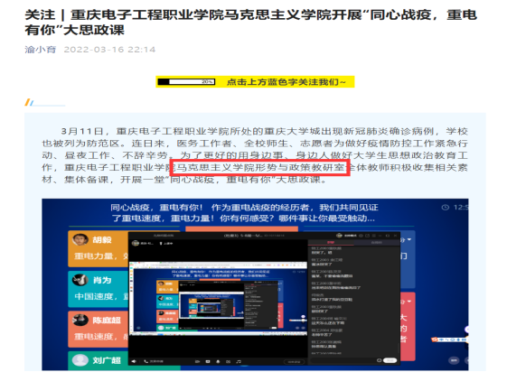 特殊时期的“大”课、“暖”课、“心”课得到了广大重电学子的认可,教学效果良好,凝聚起了同心抗疫合力。同时,也得到了媒体的广泛报道。作为思政课教师有义务积极参与重电抗疫大考,利用课堂回应学生普遍关注的思想疑惑和热点问题,让思政课成为学生思想的“稳定器”;也有义务讲好重电抗疫这堂思政课,成为疫情防控的“宣传队”,切实提升学生的安全感与获得感。在本次疫情大考中,正因为老师们用心用情讲好的这一堂堂思政课,让重电学子们进一步坚定了为全面建设社会主义现代化国家和实现中华民族伟大复兴的中国梦而奋斗的信念和决心。