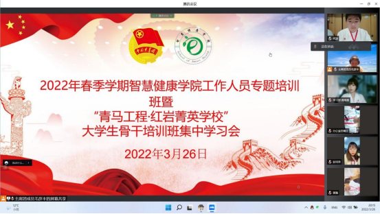 为认真贯彻落实习近平总书记关于青年工作的重要指示精神,切实加强学院团总支·学生会青年学生骨干的政治素养和工作能力。2022年3月26日晚,智慧健康学院团总支·学生会开展2022年春季学期工作人员专题培训班暨“青马工程·红岩箐英学校”骨干培训班集中学习会。本次会议由学院学生会主席团成员毛彦丰主持,团总支·学生会工作人员共计70余人共同在线学习。