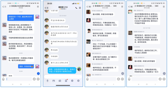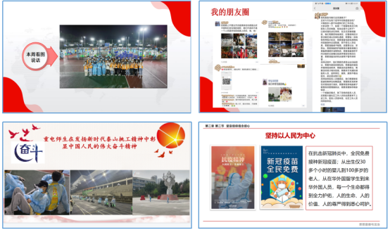 师生积极互动,教学效果突出。学生也是此次疫情防控的参与者,授课教师在课堂教学中与学生积极互动,在线上教学有限的教学环境条件下,通过各种教学形式组织学生积极主动参与课堂,从学生的视角来谈对此次疫情防控的认识和对抗疫精神的理解。各班参与了学校志愿服务的同学,如通运2101班的胡俊、移动通信2101班的郑星雨、智能互联2103班的阮鑫等同学,讲述了自己参与学校几次核酸检测的志愿服务经历和感悟,在同学中反响热烈,积极在线连麦谈感悟;智能互联2104班学生付世龙在课堂上为班上同学直播自己参与校友捐赠物资的搬运工作,学生纷纷为校友的热心捐赠和同学的志愿服务精神而感动;学生还通过课堂展示、小组讨论等方式分享体会,如智能互联2104班学生徐菲燕在分享中谈到了自己被每天吃住在学校随时关心着学生的辅导员老师、认真线上教学的任课老师、提供各种物资保障的学校各部门而感动,感受到了在疫情中重电对学生的关怀,要对学校表达深深的感谢。还有学生谈到以前是通过新闻报道了解,这次是亲身感受到了重电速度、中国速度,了解了国家在疫情防控中采取的各项有力措施,是国家带给了自己安全感,为身为中国人而感到骄傲和自豪。
