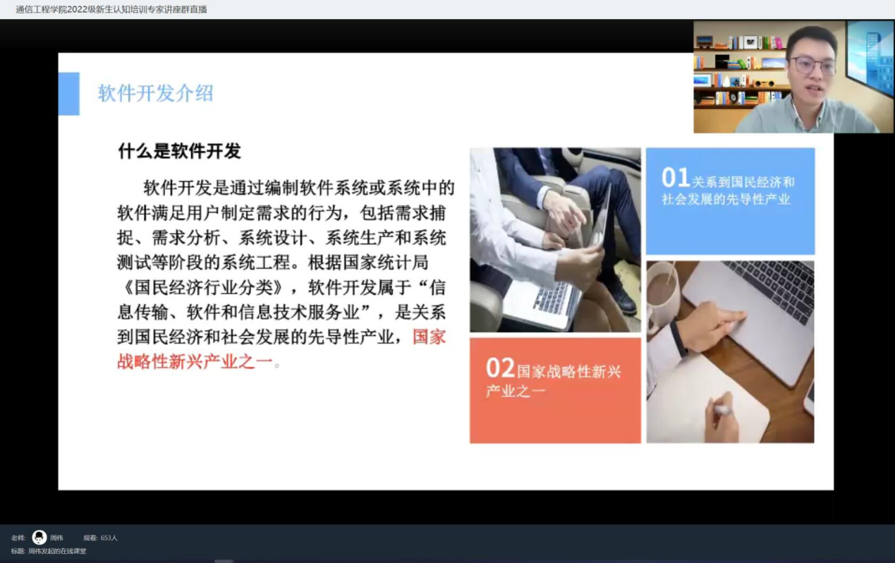 为培养学生专业认知,拓宽学生专业视野,2022年11月12日,通信工程学院特邀重庆知向云信息技术有限公司联合创始人、研发总监周伟老师面向2022级新生开展《软件开发行业发展与未来人才需求》专题讲座,由于疫情防控需要,讲座在线上进行,通信工程学院2022级近700名新生在线上观看讲座并与专家开展互动。