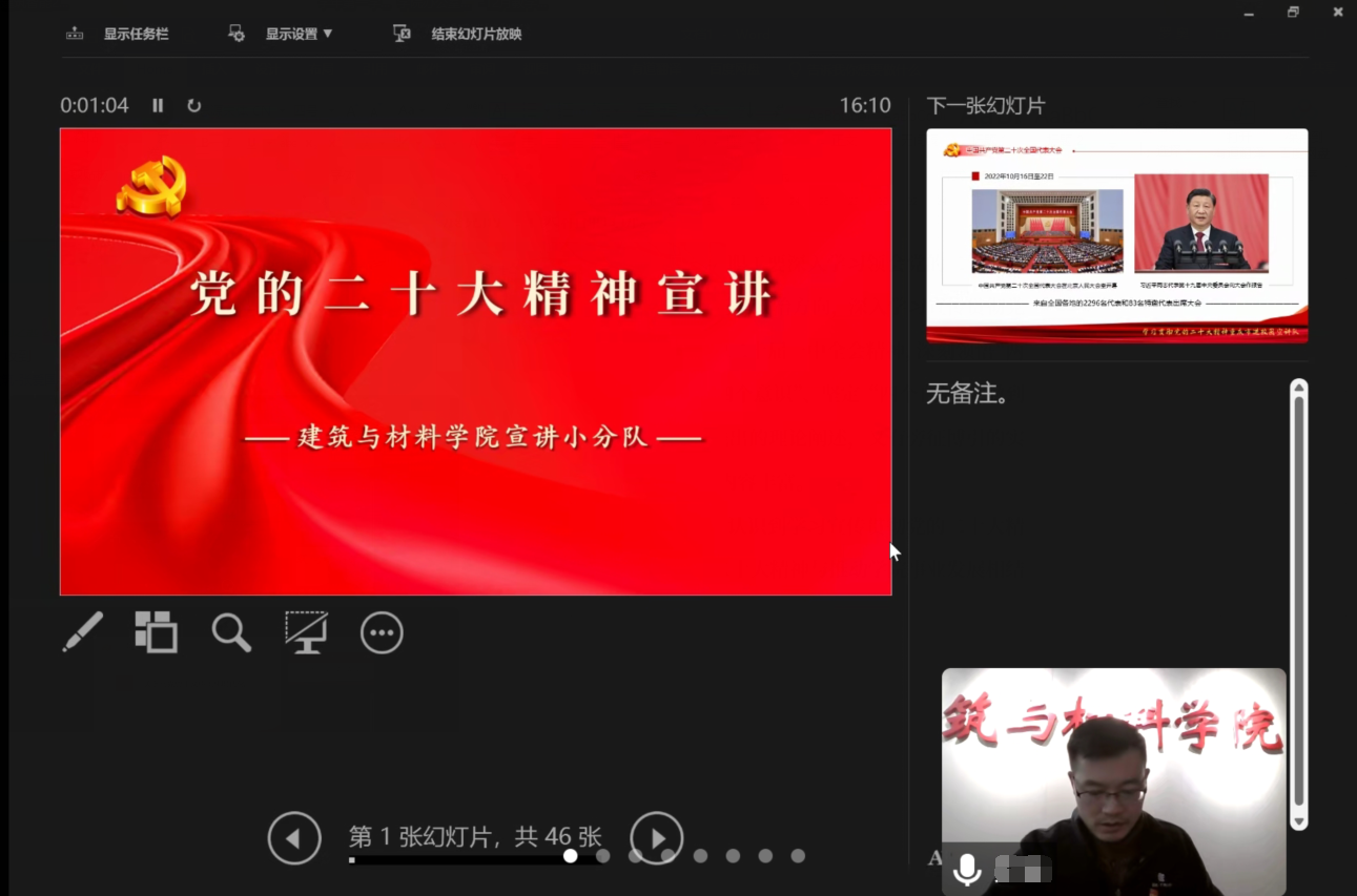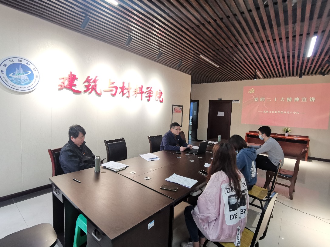为深入学习宣传贯彻党的二十大精神,11月24日下午,建筑与材料学院通过线上线下相结合的形式向全院教职工开展党的二十大精神宣讲,学院首场宣讲由学院党总支副书记袁玉刚同志主讲。