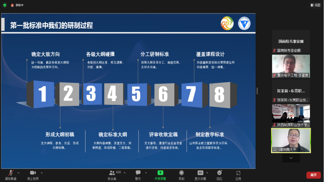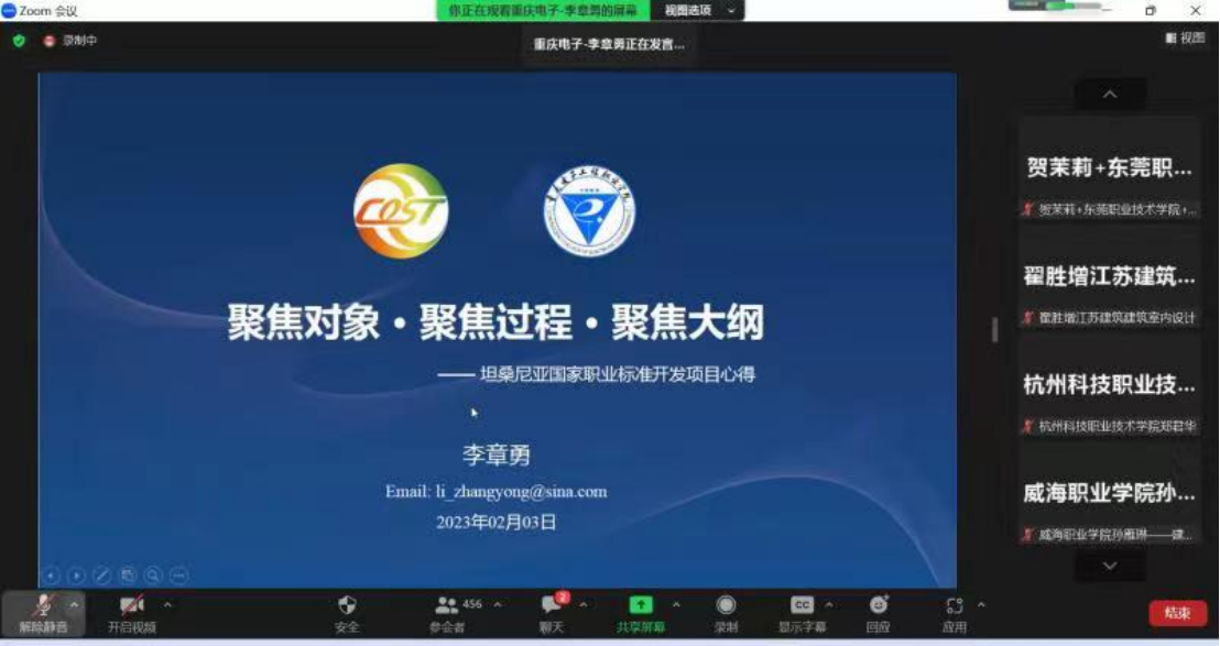 坦桑尼亚国家职业标准开发项目由坦桑尼亚教育部国家职业教育委员会与中非职业教育联盟协商发起,通信工程学院以陶亚雄教授牵头的项目团队获得第一批坦方标准中信息技术工程师7级、8级及配套专业教学标准的立项,目前项目已结题,所研成果已获得坦方认证和采用。会上,李章勇老师首先介绍了项目组在第一批坦方标准项目中的研制过程,强调了学校、二级学院的支持和帮助,然后从多校合作模式、不同等级之间的衔接方法、资料参考和大纲形成几个方面进行了经验分享,最后就如何更好地完成标准研制工作给出了建议。