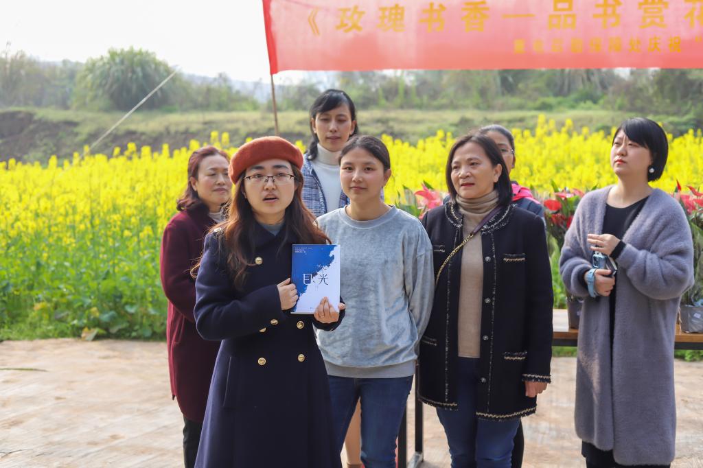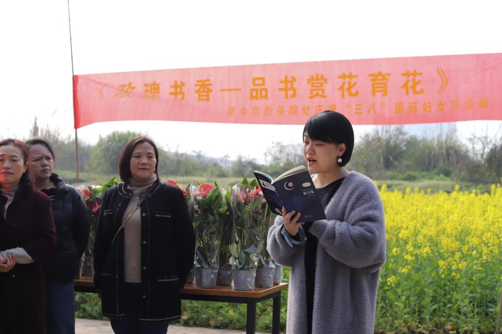 3月8日早上,太阳从云层中露出了头,一扫连日阴霾,也赶来参加这场“玫瑰书香——品书赏花育花”活动。首先,副校长黄爱明同志在活动上致辞,送上一副对联“花好人好天气好,赏花护花心不花”祝贺后勤保障处所有的女同胞节日快乐,花开不谢!