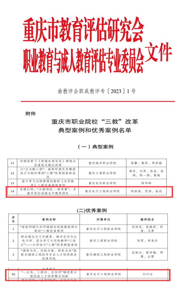 为持续推进“三教”改革工作,奋力办好新时代职业教育,推动我市职业教育改革发展,开展认证典型案例和优秀案例。近日,重庆市教育评估研究会公布了“三教”改革典型案例和优秀案例认证名单。pg国际电子与物联网学院教师在此次评选活动中斩获佳绩,入选典型案例1项,优秀案例1项。