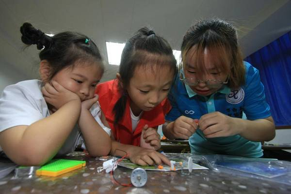 图为团中央示范项目“强国有我 ‘核’你一起”的志愿者手动教学电子元器件的组装