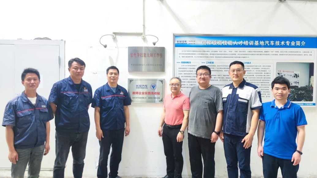 为贯彻中央人才工作会议和全国职业教育大会精神,落实新修订的《中华人民共和国职业教育法》,进一步完善校企合作育人机制,创新技术技能人才培养模式,促进职业教育更好地服务地方经济社会发展,2023年5月4日,智能制造与汽车学院党总支书记严世同、副院长王勇、合作办负责人张俊峰、自动化系副主任吴伟龙一行四人赴重庆长安股份有限公司进行教师企业实践流动站授牌。