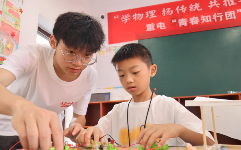 实践队成员帮助小朋友组装电路